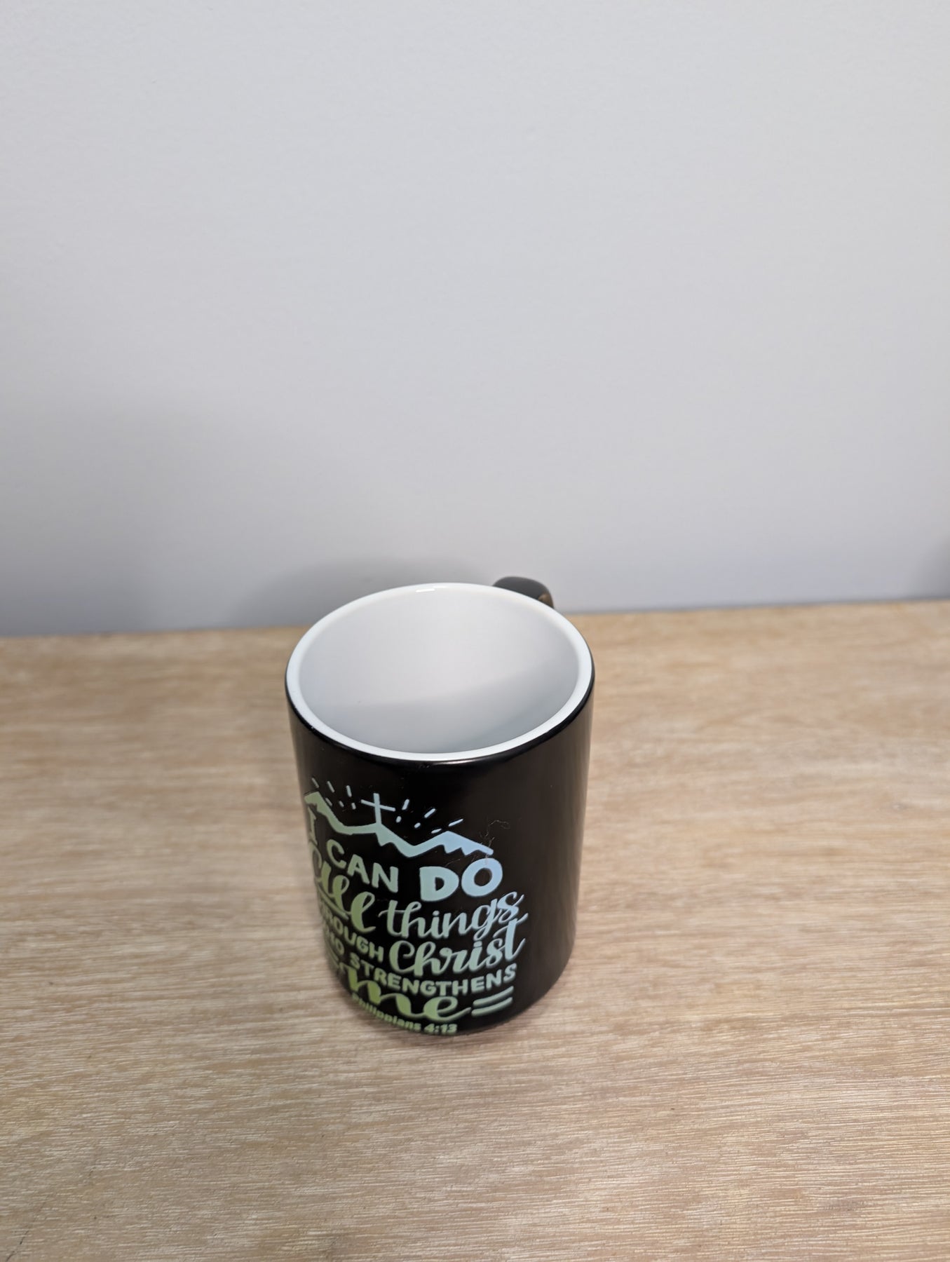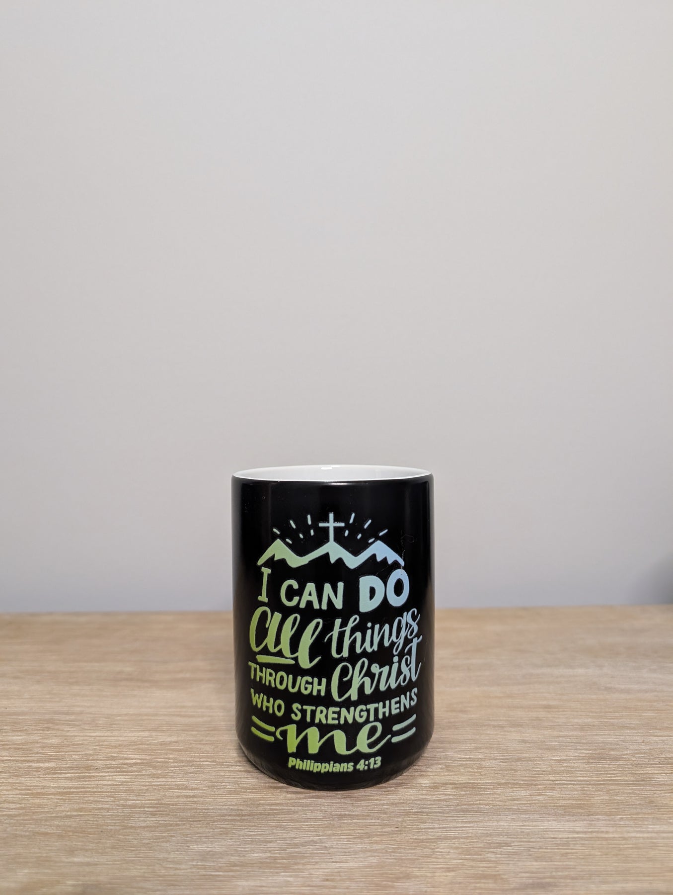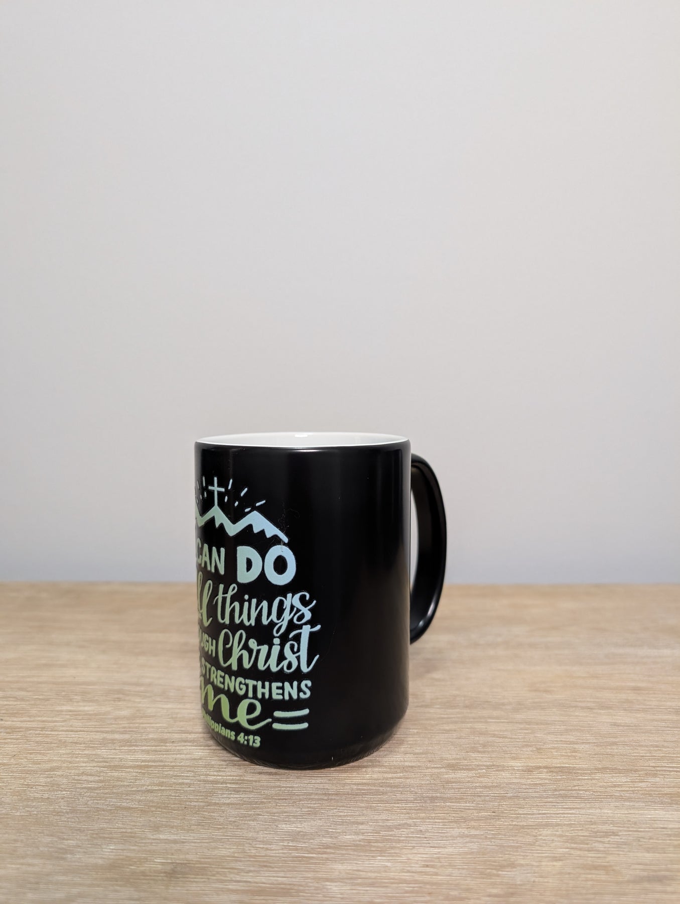 Philippians 4:13 Coffee Mug - 15 oz Ceramic Color-Changing Cup with Inspirational Quote & Design - Black Mug for Daily Motivation